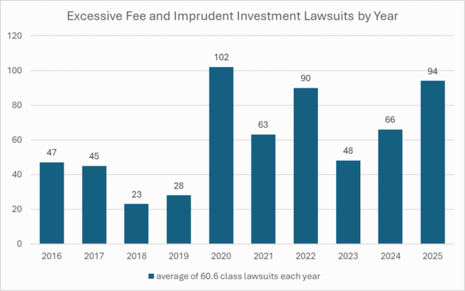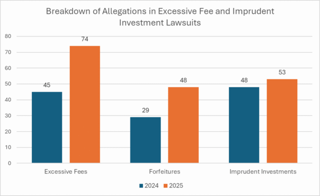 Allegations of imprudent investments remained high in 2025, with plaintiff firms shifting their focus from actively managed target date funds (which are more expensive than passive, index target date funds) to stable value funds. 27 lawsuits were filed challenging the inclusion of stable value funds, alleging they had crediting rates lower than other alternative fixed income investments available in the market. These lawsuits are still making their way through the courts, making it difficult to predict how successful these suits will ultimately be.
