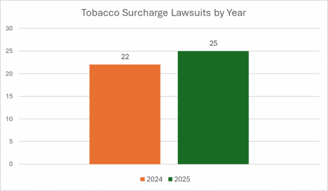 In these lawsuits, plaintiffs allege that plans have imposed premium surcharges to tobacco users in violation of ERISA and non-discrimination rules under HIPAA, and/or that wellness incentive programs which offer a reasonable alternative standard to earn or recoup the ‘full reward’ are not in compliance with federal law. Prior to 2024, one tobacco surcharge lawsuit was brought by the DOL, and within two weeks of bringing suit a judgement of less than $ 150k was rendered. [6] In 2024 and 2025, almost 50 such lawsuits were filed, 30 by one plaintiff firm, with multiple settlements just under $ 5m. [7]